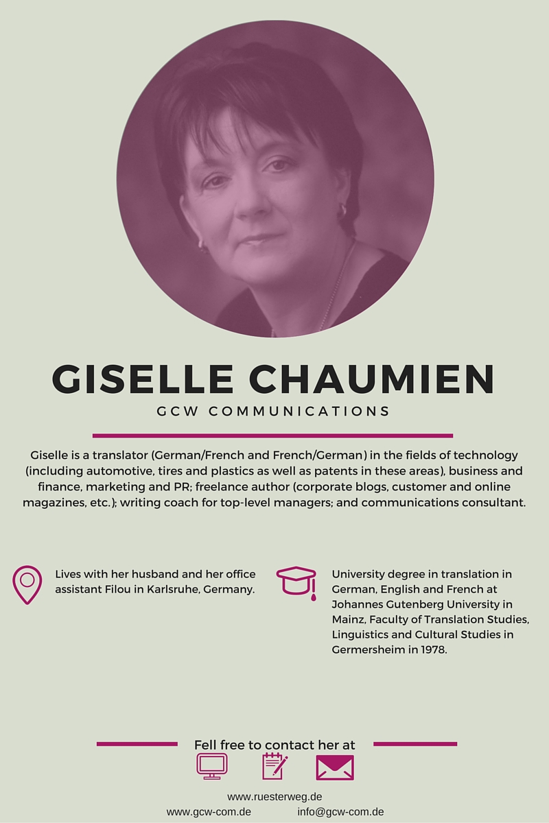 3. You have been working for Michelin for nearly 30 years! You began as a French and German teacher for managers, but then had the chance of implementing a translation department there. How cool is that? You programmed CBTs (computer-based training courses) for factory workers, organized professional development courses for managers, installed an intranet for Michelin Germany, Switzerland and Austria, and implemented an Internal Communications department in those three countries as well. I clearly see why Nicole nominated you! How does this impressive professional experience help you nowadays as a freelance translator?